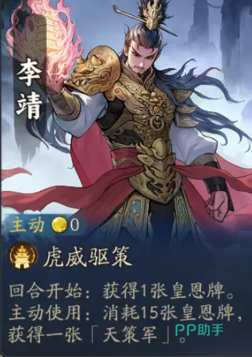 同属帝国阵营,但定位与李靖形成鲜明互补。其被动效果为:每张皇恩牌额外提供1点皇恩值。这意味着在相同数量的皇恩牌下,始皇帝可加速触发各类依赖皇恩阈值的强化效果,大幅降低运营难度,是新手过渡期最稳妥的帝国核心人选。