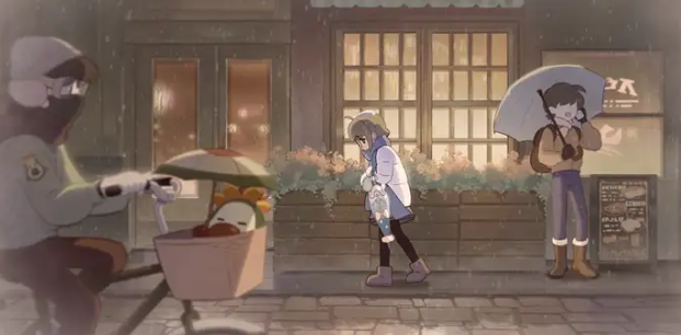 不只是下雨天,在下雪的时候,小雅即使自己冻得发抖,依然优先照顾安布蕊娜。这些点滴都被精灵默默记在心里,也因此更加珍惜这份陪伴。直到某次暴雨来临,原本总是依赖小雅保护的安布蕊娜,竟主动化作一把长柄阳伞,反过来为小雅撑起一片干爽。曾经那么害怕沾水的她,此刻却勇敢地迎向风雨,这一转变令人动容。通过PV中的对话可以感受到极强的画面代入感,原本性格内向的小雅,在彼此的陪伴中逐渐变得开朗,正是这种双向的成长与守护,才最打动人心。