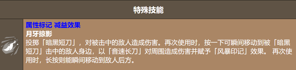 特色技能「月牙掠影」是本角色战术灵活性的核心体现:首次释放将投掷暗黑短刀命中目标,再次点击可瞬移至该敌人位置,并以音速长刀对周围造成范围伤害,同时施加「风暴印记」;若长按技能键,则执行绕背位移,实现反向切入或安全脱离。该技能既可作为先手控场手段,也可用于收割残血或调整站位,适用场景极为广泛。