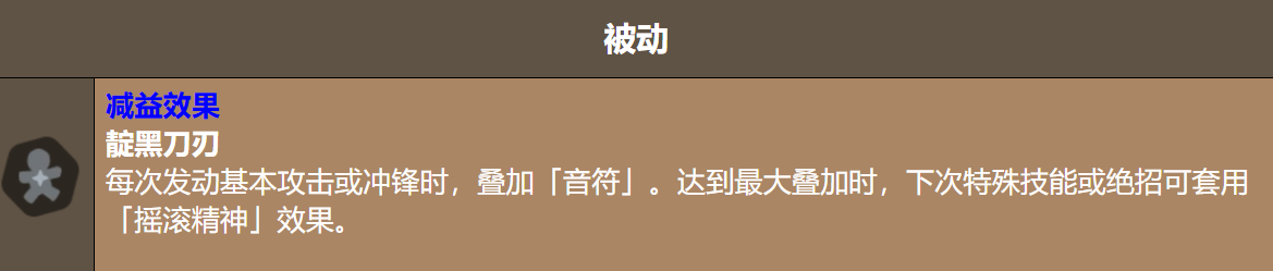 核心被动「靛黑刀刃」构成其输出循环基础:每次使用普通攻击或冲锋技能,均可叠加1层「音符」效果,最高可叠至满层;当音符叠满后,下一次施放特殊技能或绝招时,将自动激活「摇滚精神」状态,显著提升后续技能伤害。因此实战中务必避免开场直接释放大招,优先通过普攻与冲锋完成资源积攒,是高效输出的前提。