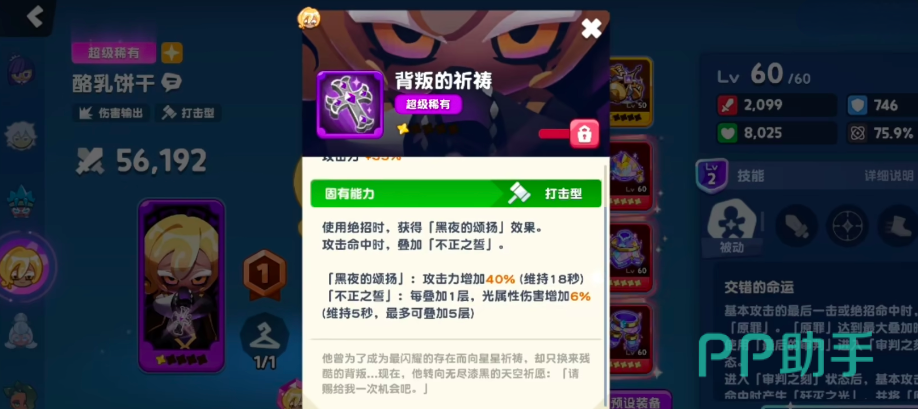 酪乳饼干的主动卡牌技能名为“背叛的祈祷”,可永久提升基础攻击力35%。释放该技能后,立即获得增益状态“黑夜的颂扬”,使自身攻击力额外提升40%,持续18秒。与此同时,每次普通攻击命中目标时,将叠加一层“不正之誓”效果,每层提升光属性伤害,持续5秒,最多可叠加5层。双增益叠加下,其输出曲线呈现显著阶梯式跃升,尤其适合在BOSS战前预热并维持高能状态。