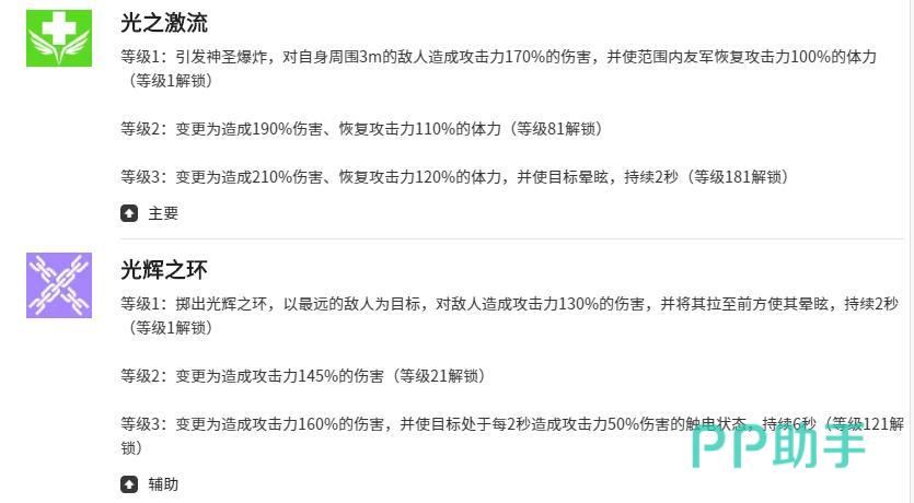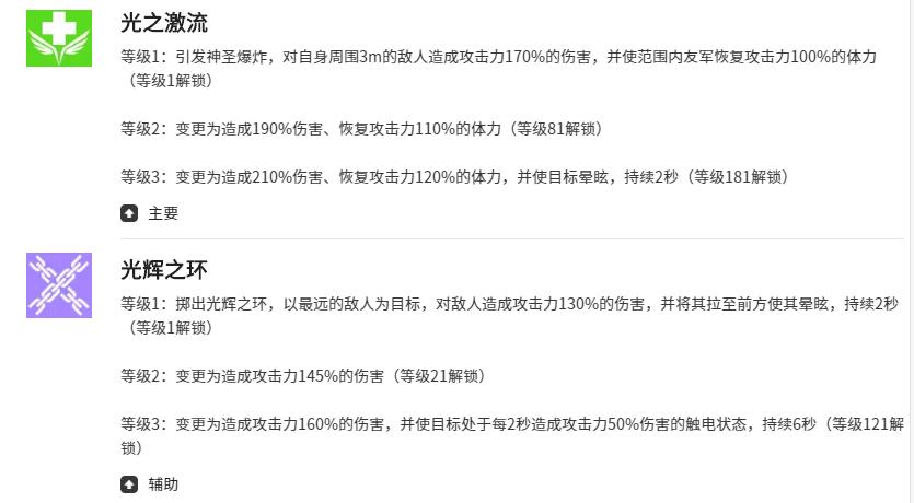另一关键主动技【光辉之环】具备精准打击与强控特性:技能以最远距离敌人为锁定目标,命中后造成130%伤害,并附加眩晕效果,同时强制将其牵引至前排位置,为后续集火创造理想输出窗口。