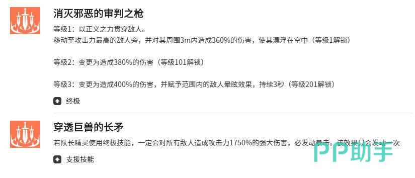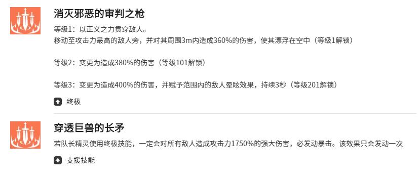 终极技能【消灭邪恶的审判之枪】是阿德里安最具战略价值的大招:以正义之力贯穿指定目标,对3米内所有敌人触发浮空控制,使其丧失行动能力并暴露于全队爆发之下;支援向技能【穿透巨兽的长矛】则提供一次性全场高额伤害,适用于关键节点扭转战局,但整场战斗仅可发动一次。