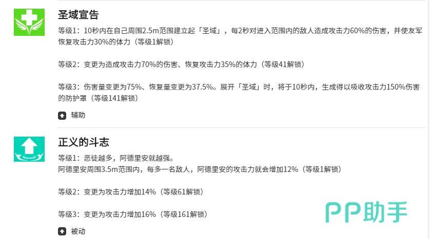 【圣域宣告】为范围持续型技能,在施法者周围2.5米内展开神圣领域,对进入该区域的敌人立即造成60%伤害;技能升级后伤害上限可提升至70%、最终达75%。此外,被动天赋【正义的斗志】赋予阿德里安动态战力成长机制:每增加一名周身敌方单位,其整体攻击力提升12%,显著增强多目标作战下的技能释放效率与压制强度。