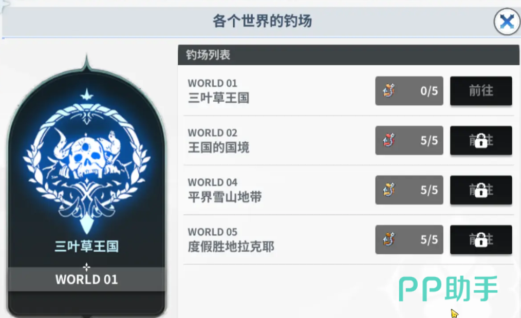 完成一轮钓鱼后,可通过“各个世界的钓场”弹窗界面选择下一个目标地点继续垂钓。随着钓鱼次数和料理制作次数的积累,系统将记录相关“实绩”,例如完成18次钓鱼、成功制作5次料理等任务目标,达成后可领取对应奖励,助力角色成长与发展。