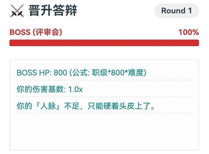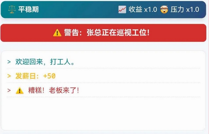 职级跃迁过程被设计为阶段性Boss战:每次晋升评审会均需直面高管团,玩家须调用“拉数据”“赋能业务”“对齐战略”等职场话术类技能进行答辩。若关键指标未达标或方案逻辑崩塌,将导致压力值翻倍,甚至触发“优化预警”事件。