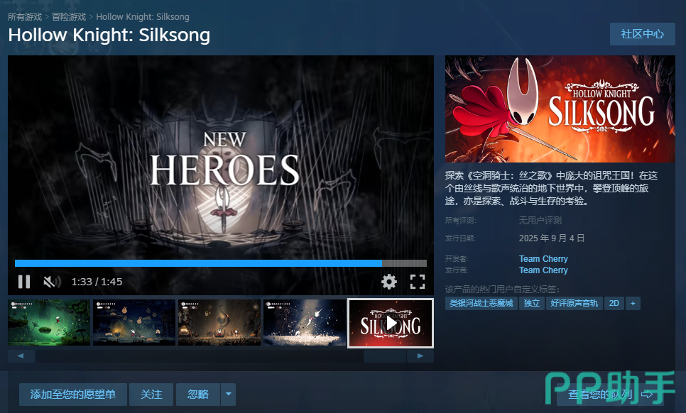 现在大家已经清楚空洞骑士丝之歌在Steam上的准确名称为Hollow Knight: Silksong,即便使用中文搜索也能跳转至正确页面。游戏支持完整中文界面,包括介绍文案、系统提示及发售信息等。建议尽早将其加入愿望单,便于第一时间掌握预购开放时间,并在正式发布后立即下载,开启全新的冒险旅程。