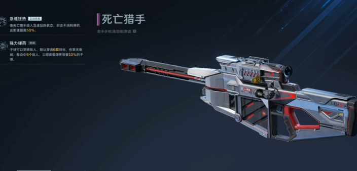 死亡猎手以极致穿透性能著称,单发子弹可穿透最多6名敌人,且对每个目标均造成全额伤害。其主动技能“极速狂热”开启后,射击不消耗弹药,同时射速提升50%,大幅强化火力持续性;当单发子弹成功命中5名以上敌人时,触发额外伤害加成,形成越战越强的滚雪球效应。该武器特别适合密集阵型对抗、据点防守及团战收割等高压力场景。建议搭配暴击伤害强化插件提升单发杀伤力,辅以换弹速度插件优化节奏衔接,最大化技能周期内的输出密度。