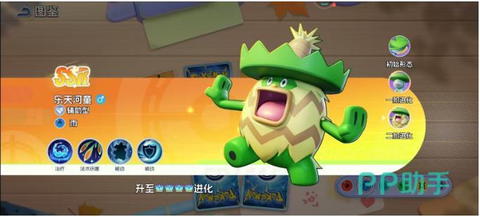 最终形态乐天河童,头戴宽檐斗笠,属性仍为水系,特性保持「湿润之躯」。其核心机制于11级解锁专属技能「连射种子」:连续发射5颗种子,每颗造成12%最大HP的特攻伤害,并附加「寄生」状态(每回合吸取目标2.5%最大HP,持续4回合)。该技能兼具AOE清场、持续吸血与团队治疗(吸血量的50%转化为全体友方HP恢复),使乐天河童成为少有的集压制、续航、反打于一体的战术枢纽。在高强度团战中,其存在本身即可改变敌方站位逻辑与技能释放节奏。