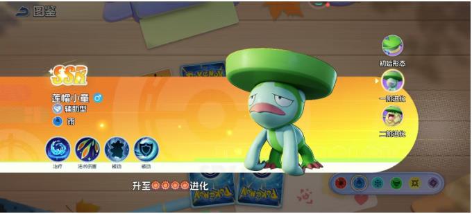 初始形态莲叶童子,头顶翠绿叶片,属性为水系(非雨属性),基础定位为治疗向辅助。其技能组已包含「水之誓约」与「治愈之愿」,并拥有两个关键特性:「湿润之躯」(提升雨天环境下特攻)与「叶绿素」(晴天时速度翻倍)。虽未掌握高阶控场手段,但凭借稳定回血与状态维持能力,能有效延长主力输出的作战时间,是新手期最可靠的团队续航支点。