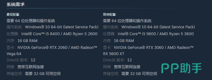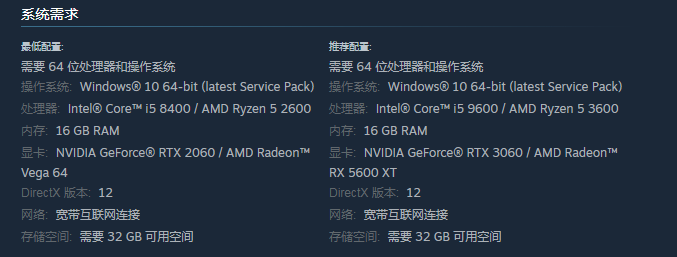 要想满足游戏,还需要保证最低的配置,需要64 位处理器,在操作系统方面可以选择Windows 10 64-bit在处理器方面可以选择Intel Core i5 8400,除了这些要求之外,内存还有显卡方面都不可以忽视,内存起码需要16 GB RAM,显卡这一方面主要是选择2060或者AMD Radeon Vega 64。