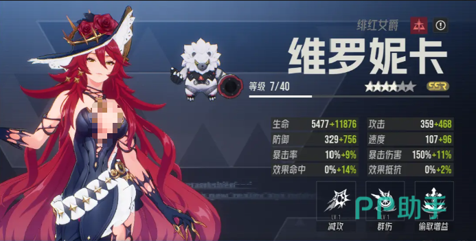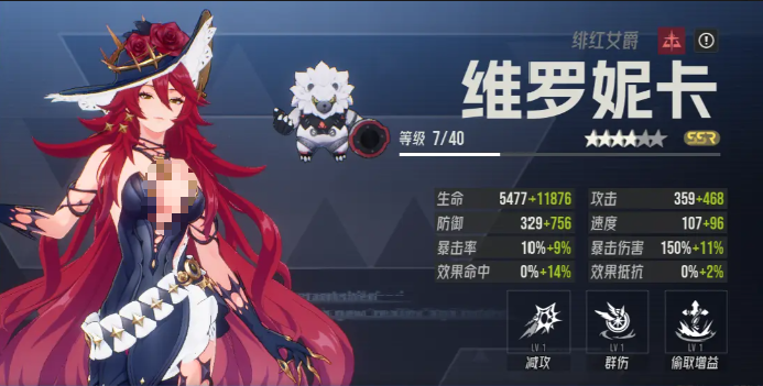 她的普通攻击名为”玫影刺”,可对单一敌人造成240%的伤害,并有40%的概率附加1轮“攻击下降”状态。被动技能“折枝”则赋予她在受到攻击后提升35%行动速度的能力,每回合可触发一次。这一特性显著增强了她在战场上的机动性,使其能够更快地进行反击或调整出手顺序。