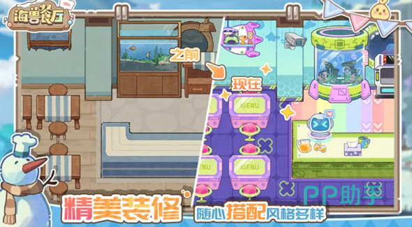 本作采用清新可爱的美术风格,整体画面温馨治愈,为玩家营造出舒适的视觉体验。在游戏中,你可以打造专属的海底主题餐厅,通过不断升级设施、优化服务流程来提升顾客满意度。