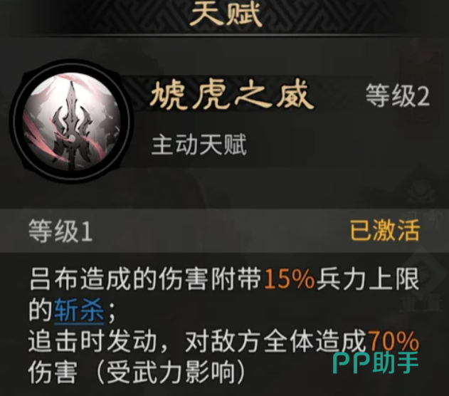 吕布的核心机制围绕“追击”展开:每次追击行动时,对全体敌方单位造成相当于自身兵力上限15%的斩杀伤害,并附加70%基础伤害。当天赋升至2级后,若通过斩杀效果击败敌人,将立即对一名随机敌方目标追加75%伤害,该效果每回合最多触发2次;升至3级后,可在伤害结算前主动发起武力比拼,与敌方全体英雄进行武力对抗,胜者获得额外压制优势。