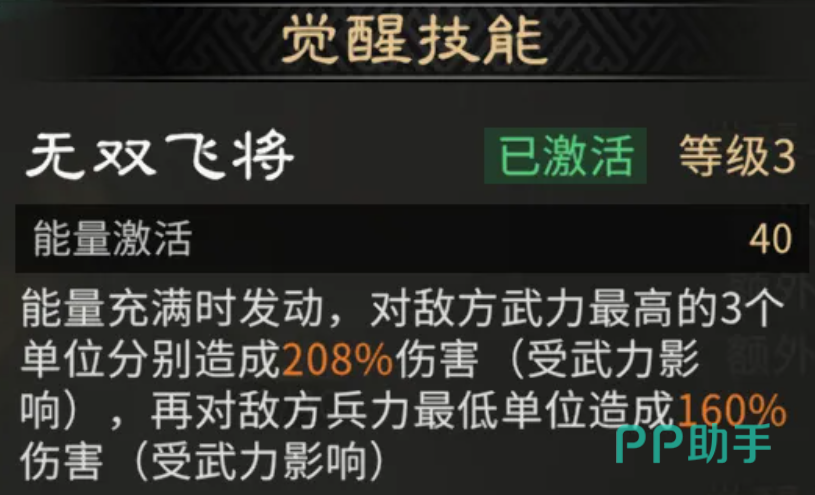 战斗中每取得一次胜利,吕布自身武力值提升2点、斩杀伤害上限提升1%,该增益持续2回合,最高可叠加4层。其觉醒技在能量满格时自动释放:优先对敌方武力值排名前三的目标各造成280%伤害,随后锁定敌方当前兵力最低单位,施加160%单体伤害,有效弥补了追击机制在单体终结能力上的局限性。