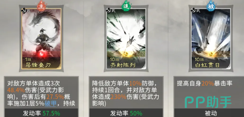 技能配置方面,优先选择能强化追击频率、提升武力成长或增强斩杀收益的主动技与被动技,具体搭配方案参见下图所示三技能组合。