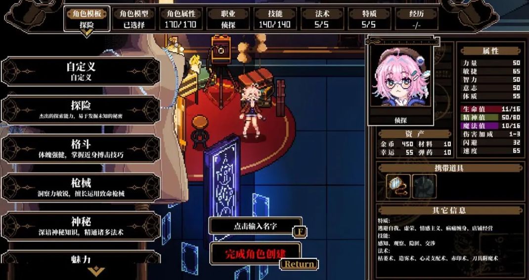 在视听风格上,《心之钥》融合像素美术、复古UI、低饱和色调与克系视觉符号,营造出兼具怀旧感与心理压迫感的独特氛围。它既非动作导向型RPG,亦非纯文本驱动的视觉小说,而是一种强调沉浸式推理、环境感知与叙事参与度的混合型交互体验。新手入门建议优先完成首个模组全流程,熟悉判定逻辑与属性作用机制,避免沿用传统ARPG思维追求属性最大化——合理失衡有时正是通往深层剧情的关键钥匙。