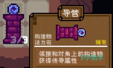 接下来是导管这一稀有构造物。该道具需与法力石紧密配合放置,能够增强邻近以及对角位置上其他构造物的传导属性。但由于其自身具有特定的空间需求,摆放时应避免置于过高的格子中,否则会影响整体结构稳定性,导致属性加成无法正常触发。