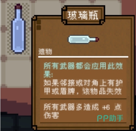 遗物类道具同样是构筑策略的重要部分。例如玻璃瓶,能在满足条件时为所有武器附加6点伤害加成,但前提是其上方或对角位置不能存在护甲或护盾类物品,否则效果失效。类似地,炸弹等其他遗物也具备多样化功能,包括回血、减伤等辅助能力,合理搭配可在关键时刻扭转战局。