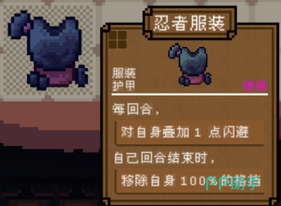 胸甲系列同样不可忽视,包含青铜胸甲、束腰外衣以及忍者服装等多种选择。这些装备普遍拥有每回合可触发的被动能力。尤其是紫色品质的忍者服装,因其大幅提升闪避速度并移除100%格挡效果而广受青睐。此外,在己方回合结束时,该套装还能清除自身全部格挡状态,非常适合需要高机动性的战斗场景。