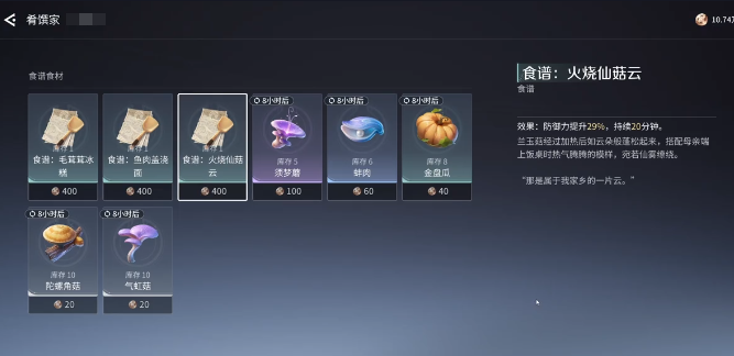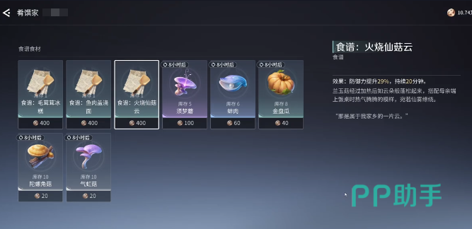 需注意,“火烧仙菇云”的食谱并非通过主线或日常任务发放,必须前往指定NPC处购买。具体坐标位于稷下群山区域的潭影营地。玩家打开大地图后可直接搜索“潭影营地”进行定位,营地标识清晰,沿主干道步行即可抵达。营地内可找到NPC“余欢”,其身份为肴馔家专属食谱商人,仅出售厨师类配方。与其对话后,使用常规游戏货币即可购得该食谱,价格设定为固定数值,不消耗稀有资源或限时道具。购买后进入背包界面点击学习,随后前往烹饪功能入口——“食不厌精”模块,在料理列表中定位“火烧仙菇云”,查看所需全部材料清单。