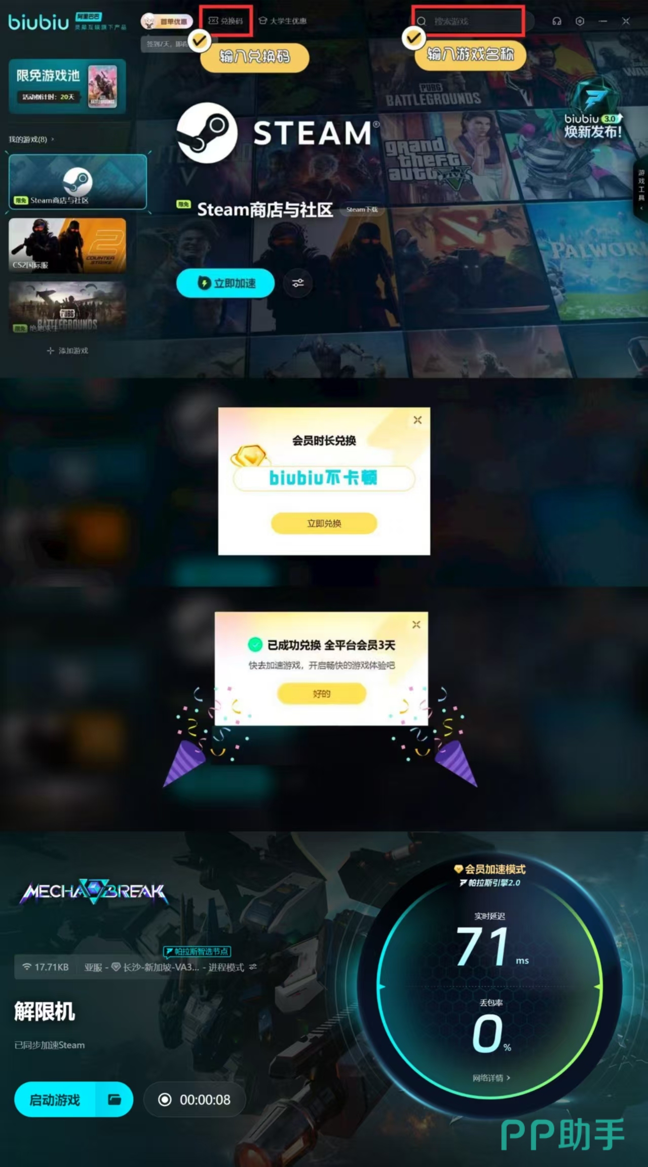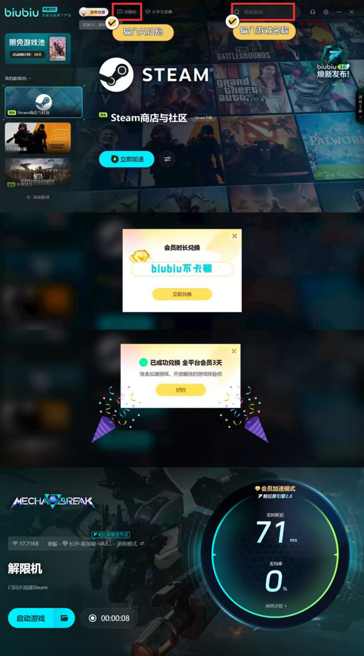 解限机的机甲种类非常多,而且这些机甲还可以适用于不同的场景中战斗,甚至还能实现全球的空中作战,但是作战过程中容易卡顿,尤其是多人作战的时候直接卡住,那么就可以使用biubiu加速进行一键优化,并且新人在注册后便获3小时免费加速,新老用户均可使用兑换码【biubiu不卡顿】可获3天免费的加速时间哦!