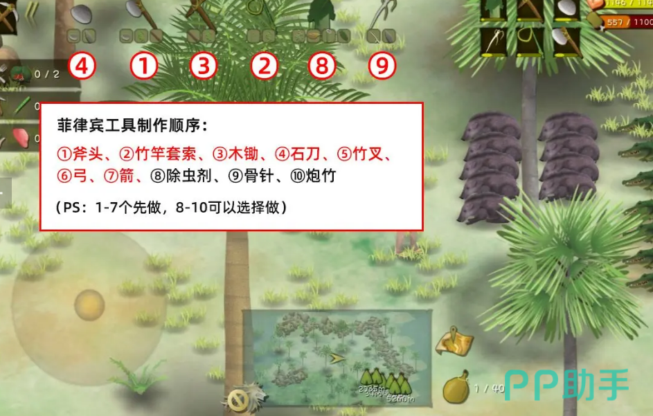 上面的这几个物品一定是大家要第一时间进行收集材料制作的,而【除虫剂】和【炮竹】可以选择性的来做,在游戏里刚开局的时候,是会在地图中刷新一个简易的营地的,这个营地周围的环境非常方便大家去度过前期较为严峻的环境!在营地周围是有竹林的,大家到达营地后,可以先去收集竹子,做成【竹筒】来节水喝,下雨天的时候竹筒会自动接满水,在实用竹竿和麻绳制作出一个【锁套】,这个物品则是用来抓捕一些海鲜!如果大家在制作出弓箭后,实在是不知道如何进行使用的话,推荐大家可以使用海滩上掉落下来的【椰子】去作做成【椰子陷阱】,这个陷阱的话,一定要注意,不管是什么类型的陷阱,放置在地图中一定不要超过八个,如果超过的话,是会非常容易坏的,长时间去制作的话,肯定是很消耗时间和资源的!由于营地靠近海的位置还是比加近的;