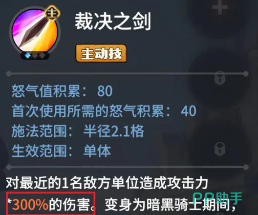 主动技 - 裁决之剑:属于主动性技能,可以给一名敌方单位造成300%以上的伤害。在变身为暗黑骑士时,寻找敌人的半径就可以直接提升到24个,可以一下子就移到目标的身边具有出色的秒杀脆皮能力。在完成突破之后,变身期间血量越少则意味着所造成的伤害越就越高,可以连续性的释放,这就是残局收割的主要核心。