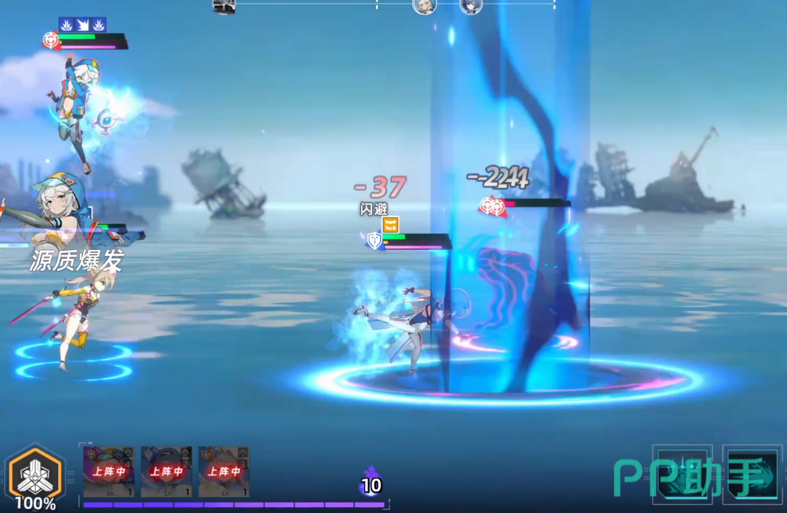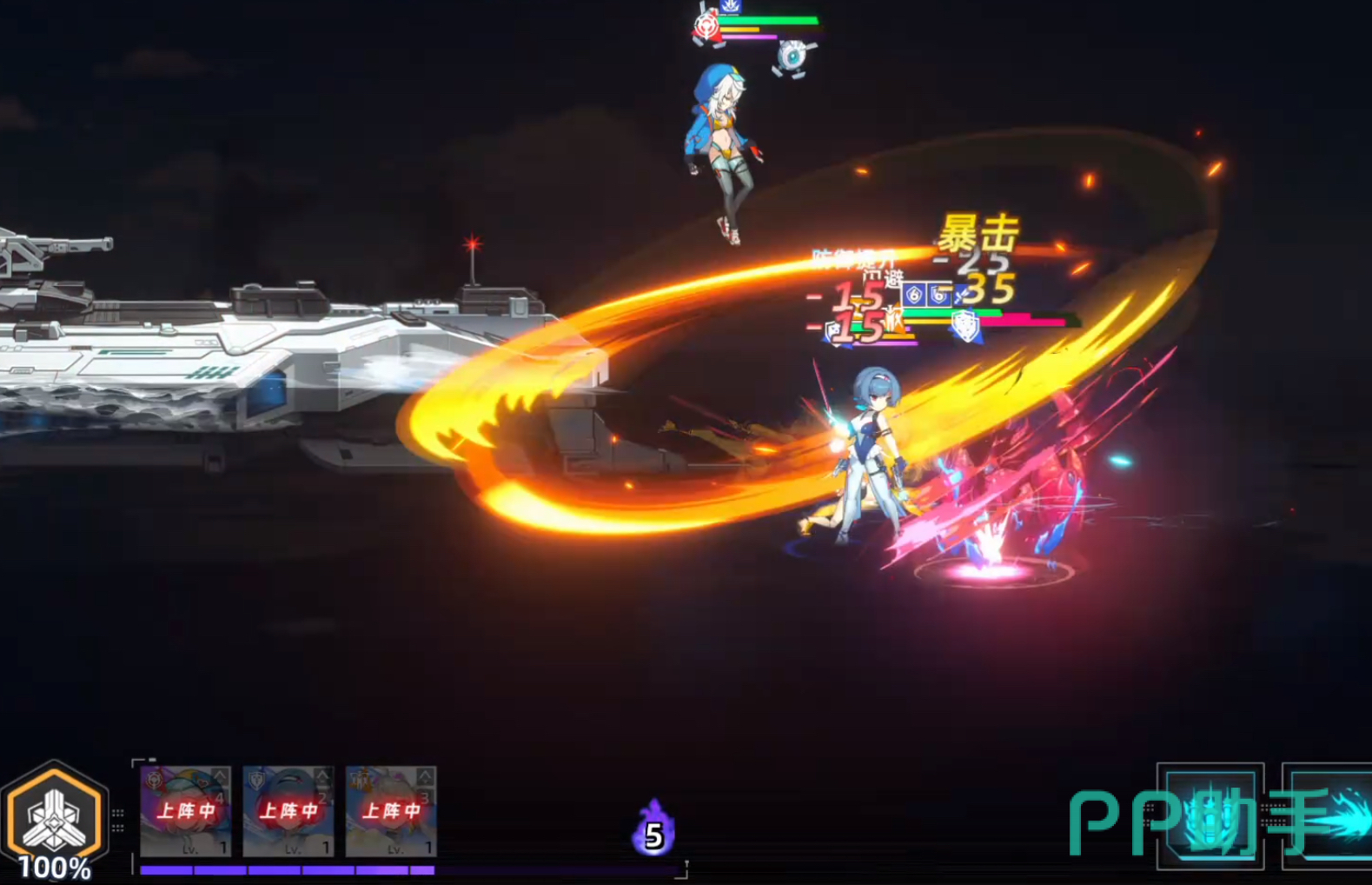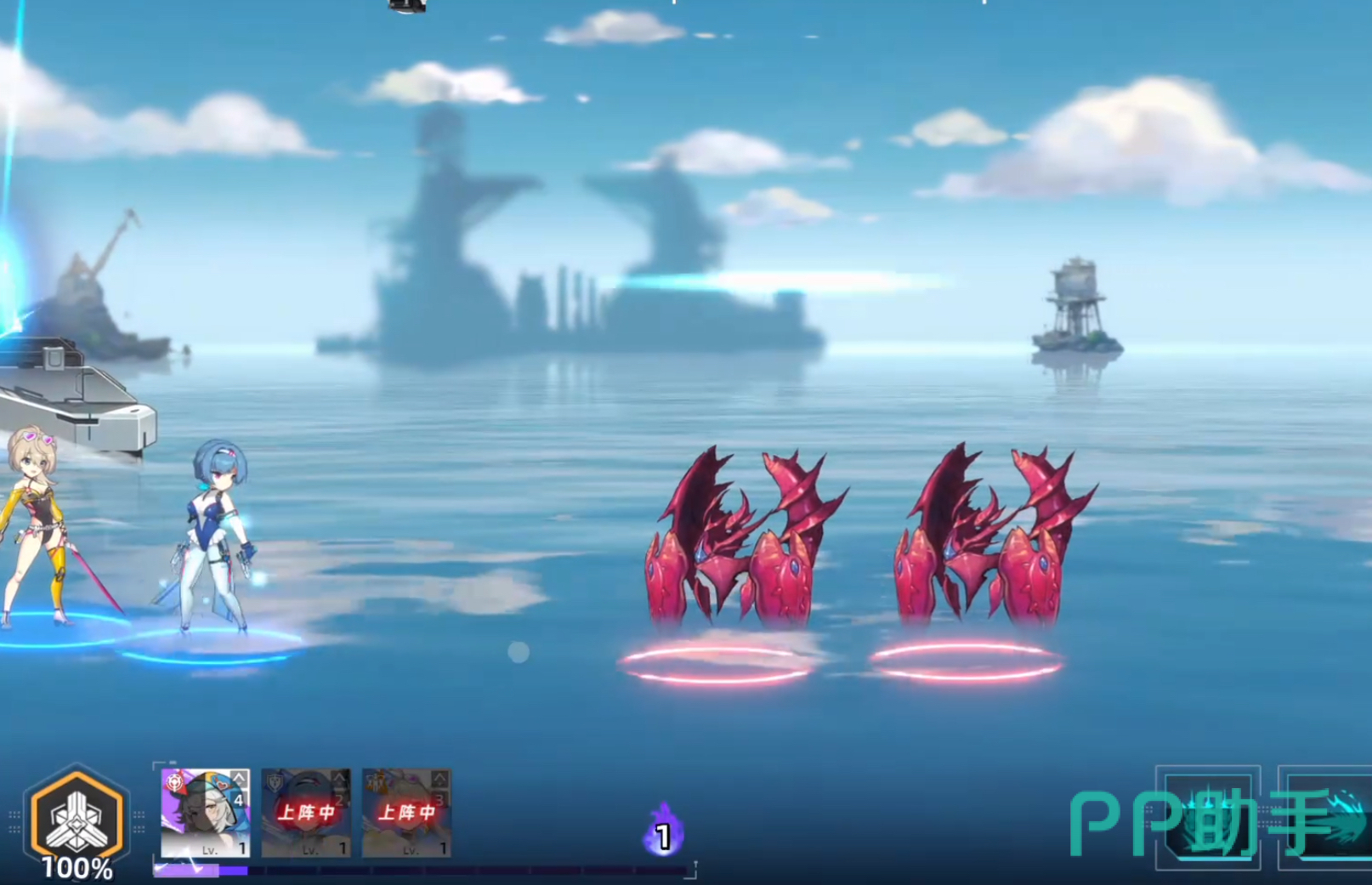 在战斗界面中,玩家需从左下角舰娘头像栏拖拽角色至战场区域部署单位。每位舰娘上场消耗2点Cost(以紫色进度条显示),而武装舰会持续恢复该资源,因此需动态规划部署节奏,保障前线战力密度。舰娘头顶的紫色能量条蓄满后可手动触发奥义必杀技,实现高爆发输出。此外,左下角设有两个技能图标——即武装舰专属技能,当图标亮起时点击即可释放,为战斗提供战术支援与属性增益。