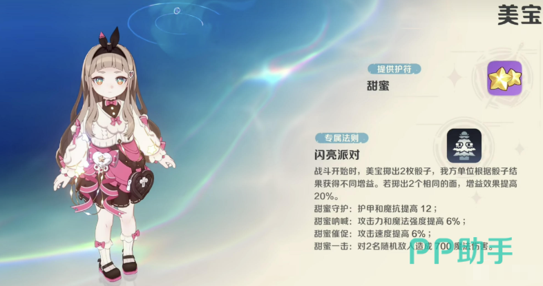 美宝是一位拥有甜美气质的女性精灵,外观上以黑色蝴蝶结点缀,展现出浓厚的少女风格,视觉表现极具亲和力。她在战斗中定位为辅助型角色,核心技能名为“闪亮派对”,属于开局自动触发的被动效果。战斗开始时,美宝会投掷两枚骰子,根据点数结果为全队随机赋予一项增益状态。这种机制带来了较高的不确定性,但也让队伍在不同战局中具备更多变数与应对潜力。