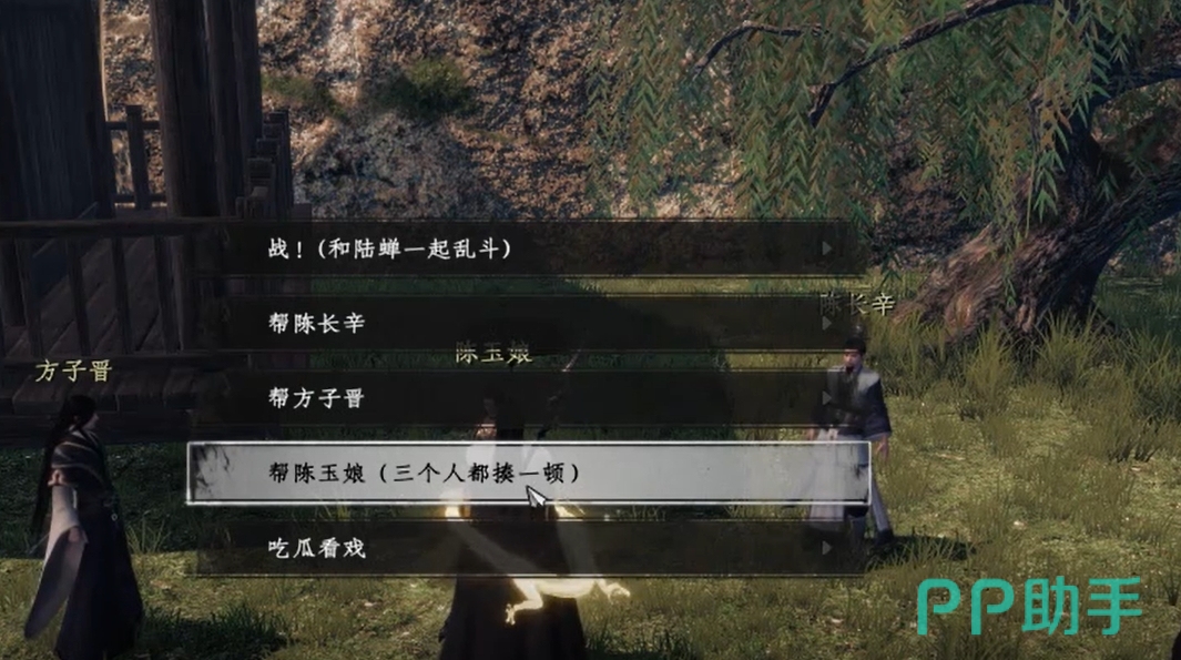 与杨陆蝉交谈后,他会告知玩家陈长辛已经同意教玩家,但要先看一下玩家的资质,随即便会进入与杨陆蝉的战斗。战胜杨陆蝉后,方子晋就会出现,并要带走陈玉蝉。对话结束后,各位可进行选择,若选战就会和杨陆蝉一起开启乱斗,与在场之人进行混战,选帮陈长辛就会与方子晋在战斗,选帮方子晋就与陈长辛打,倘若各位选陈玉娘,那么就会同时与方子晋、陈长辛和杨陆蝉对战。最后一个吃瓜看戏则是看着他们打。不光选哪个,等打完后都能从陈长辛手中得到太极手记,并完成太极之道任务。