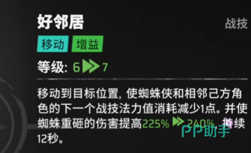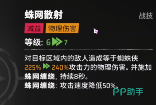 此外,“好邻居”技能允许蜘蛛人快速位移至指定位置,并为周围队友提供增益效果。下一轮行动时,战技消耗的法力值将减少,同时“蜘蛛重砸”的伤害也会得到提升。这些增益效果可持续12秒,多次使用后可叠加强化。另一项重要技能“蛛网散射”则能覆盖范围内所有敌人,造成一次性物理伤害并附加持续8秒的缠绕状态。处于缠绕状态下的敌人攻速下降,且每次攻击都有几率激活蜘蛛人的天赋追击。