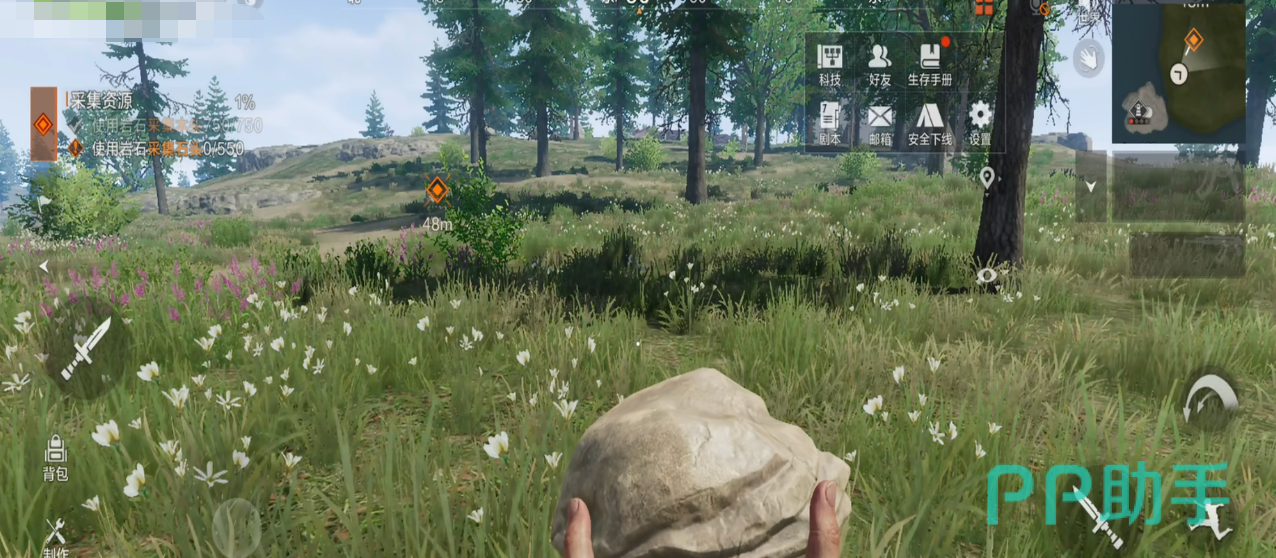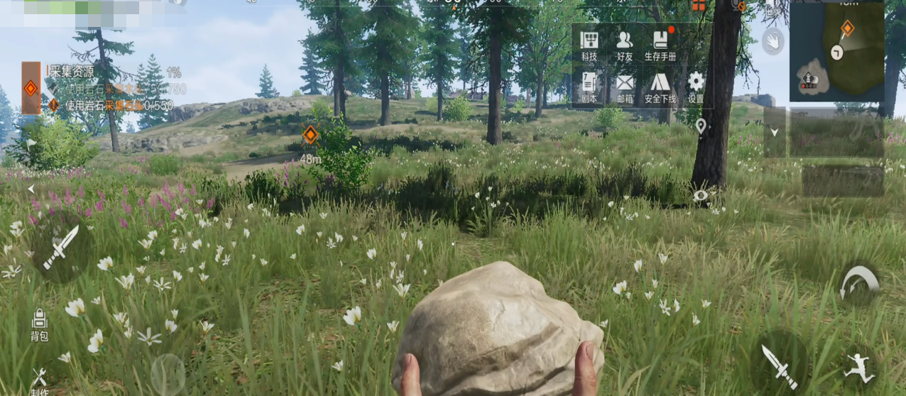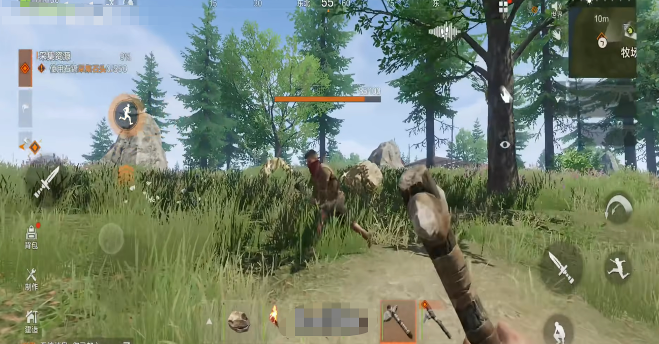 开局零装备设定大幅强化真实感——玩家初始仅能依靠徒手采集基础资源。例如通过精准击打树木红点区域可提升木材获取效率;积累足够经验后解锁石锤,显著加快伐木速度;中后期逐步开放矿石开采系统,不同种类矿石可锻造高伤害近战武器、远程枪械配件及高耐久度建筑构件,为基地防御与野外作战提供双重支撑。