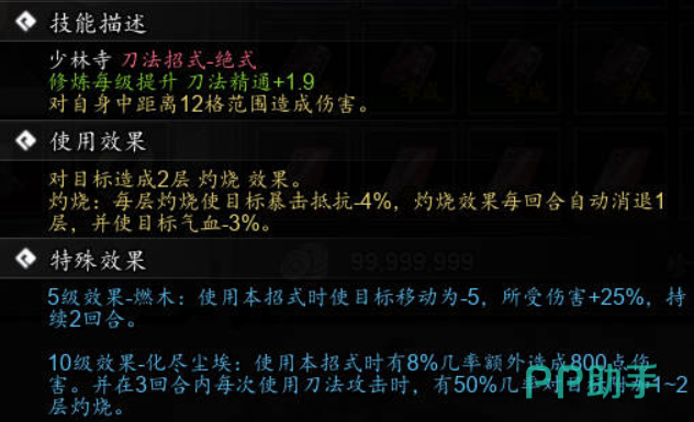 接下里,小编来为大家细致的介绍燃木刀的具体技能效果。玩家使用燃木刀可以对敌方造成灼烧效果,可叠加两层,两层灼烧可共减敌方8%的暴击率,每回合该效果减退一层,消减地方血量3%。当技能升至五级时,燃木刀可使敌方向后移动5单位,并且造成的伤害+25%,该效果最长可持续两个回合。当技能强化到10级时,可以触发效果化尽尘埃,有8%的几率可以使地方额外造成800点伤害,在使用该技能后,在3哥回合内再次出刀,都有着一半的几率可以在地方身上挂上一层或者两层灼烧效果。