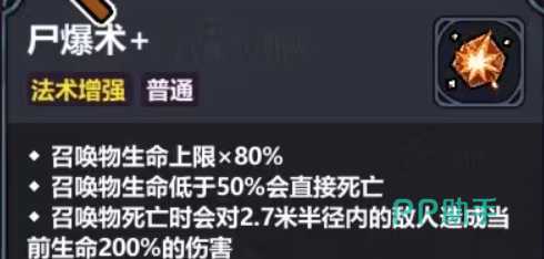 使用尸爆术后,所有召唤物的生命上限会被降低,并在生命值低于50%时立即死亡,触发一次相当于其当前生命值200%的爆炸伤害。这一机制的关键在于提升召唤单位的血量与刷新频率。因此,推荐搭配“自爆虫巢”作为核心召唤物。