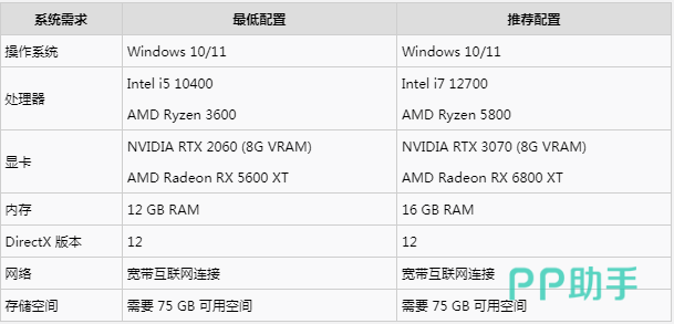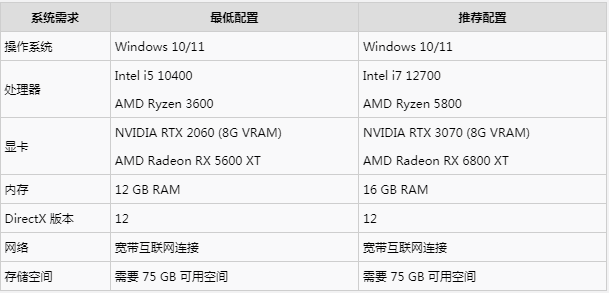建议操作系统方面选择Windows 10/11,处理器这方面可以考虑AMD Ryzen 3600,内存还有储存空间这方面主要是保证12GB RAM,需要75GB可用空间。要说在众多的配置中,比较关键的就是显卡NVIDIA RTX 2060,正确的选择可以让后续的体验变得更加顺畅。