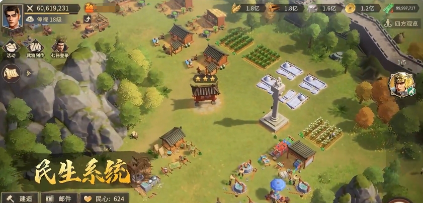 在武将培养方面,技能升级应遵循“主3次1,2”的原则,优先强化主动技能,最大化输出效率。民心值的获取可通过合理布局实现增益:伐木场邻近树林建造,田庄靠近河流设置,石场置于山脉区域,并在其周围配套建设对应仓库,可显著提升资源产出效率。野外战斗时应善用地形进行站位控制,保护主力部队免受围攻。同时,尽早抢占铁矿资源点至关重要,因其在中后期建设中需求量极大。