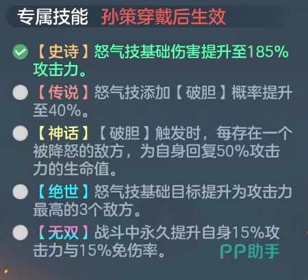 其怒气技能除对前排敌人造成155%伤害外,对已带有“灼烧”状态的目标还将额外提升15%伤害,并有20%几率触发“破弹”状态。一旦命中目标被施加“破弹”,将直接降低其怒气值,从而延缓甚至阻止敌方关键技能的释放。配合天赋系统,当孙策达到传说1星时,将解锁“虎魂”被动技能。