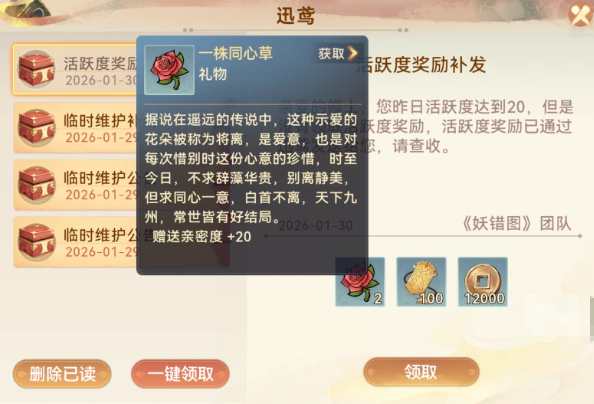 第四种日常化获取途径为活跃度宝箱系统。玩家通过完成每日任务积累活跃度,达标后即可开启对应档位宝箱。该宝箱为固定产出机制,虽同心草出现数量具有随机性(每次1–3株),但每日稳定可得,适合作为新手过渡期的基础供给来源。