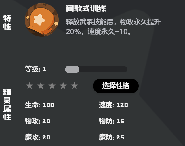 给健猫教练在搭配技能之前,我们需要先给它选择好性格,游戏中精灵的性格分为保守、稳重、冷静、固执、认真等30种,健猫教练的极品性格,小编这里推荐勇敢、调皮这类性格,这类性格可以增加物理攻击减少魔法攻击。