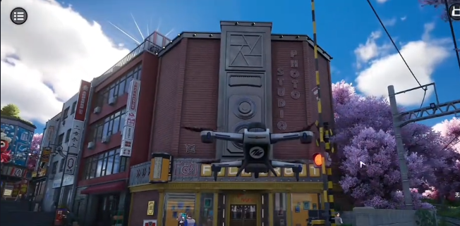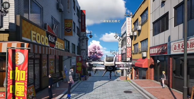 第一处拍摄点位于照相馆正门外侧。开启照相模式,召唤无人机,将镜头对准门店完整正立面(需确保门头招牌、门框及两侧立柱全部入镜),待系统弹出“目标已记录”提示即完成;第二处目标位于照相馆出口右侧街道尽头的独立门面建筑,同样需启用照相模式,保持画面构图稳定,覆盖建筑主体结构;第三处目标沿用相同出发路径,在同一街区延伸段可见一座风格化石雕,雕像基座旁站立两名NPC,其中一名正手持传单,将其作为中心焦点完成取景即可判定成功。
