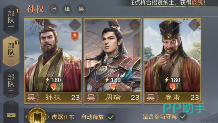 阵容采用孙权为统帅,周瑜为核心输出,鲁肃承担辅助职能的三核结构。孙权作为主将,核心价值在于加速全队技能轮转节奏。其怒气回复效率直接决定虎踞江东的释放频率,因此技能配置需优先选择具备怒气增益效果的主动技,并搭配具备伤害转化治疗能力的续航型技能,在保障持续作战能力的同时,有效延缓兵力衰减速度。属性方面,孙权骑兵适性与兵力均为S级,领兵上限达14200,统帅与智力双维成长突出,完全胜任前排指挥位职责。