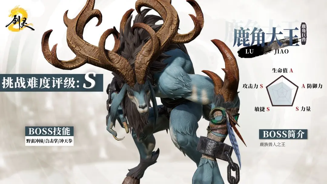 剑灵2中的鹿角大王是一种头上长着一对巨大的鹿角,浑身皮肤呈青色的鹿族兽人造型,光从外表就不难看出鹿角大王是一种力气比较大而且脾气还不是特别好的暴躁boss。