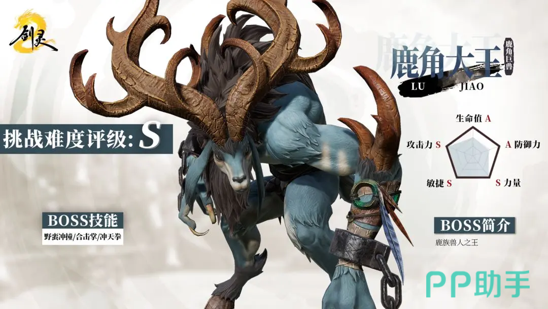 鹿角大王是一个挑战难度被评定为S级别的boss,它的各方面能力都非常的高,生命和防御力高达了A级,力量、攻击力以及敏捷高达了S级,可以说这是一个高防御高攻击,同时还极为敏捷的boss了。