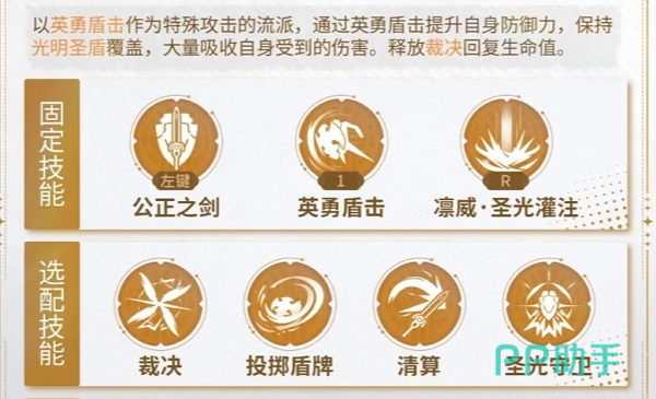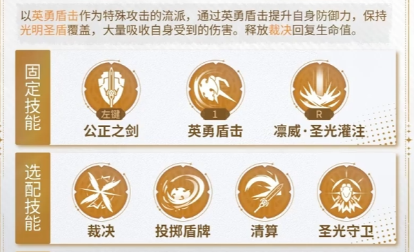 神盾骑士共有三个固定技能,分别为公正之剑、英勇盾击和圣光灌注。另外还有4个选配技能,分别为裁决、投掷盾牌、清算和圣光守卫。根据玩家自身配装和选择流派的不同,可以选择合适的技能,以便在战斗时发挥出最强的作用。