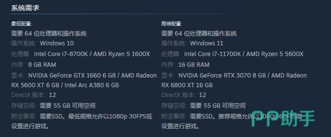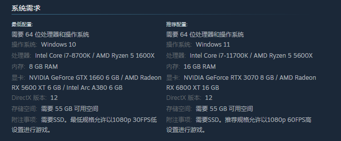 在操作系统方面可以选择 Windows 10,方面也有多个选择,例如Intel Core i7-8700K / AMD Ryzen 5 1600X,游戏时显卡是比较重要的,可以关注Intel Arc A380 6 GB,另外还有一个附加注意事项,最低规格是1080p 30FPS低设置进行游戏。