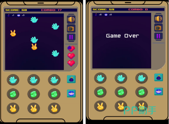 这款根据现实生活中,大家都了解的石头剪刀布游戏规则,所设置的游戏,也是玩法比较独特的,需要在屏幕上面出现石头剪刀布,这三种不同手势的情况下,利用正确的手势将其消除,不能让手势掉落到屏幕的最底端,就可让玩家获得很高的分数。在挑战的时候,也需要有很好的速度观察屏幕上所出现的手势,点击正确的手势,就可完成消除。