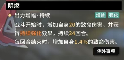 阴燃技能会在觉醒解锁后可以使用,其中的出力增幅带有持续战斗效果,在战斗一开始便能为不知火带来致命伤害提升,初始即可增加10点致命伤害,并且还伴有持续强化效果,这一强化状态能够稳定维持长达24回合之久,更为关键的是每经过一个回合的交锋,不知火自身的致命伤害还会稳步增长1%,这种随着战斗进程不断累积伤害的能力,使得她在持久战中愈发恐怖,当技能升级后在RANK5时,战斗开始时能增加15点致命伤害,每回合结束时致命伤害的提升幅度变为12%,到 RANK9初始致命伤害增加值达到20点,每回合结束时的提升比例为1.4%。