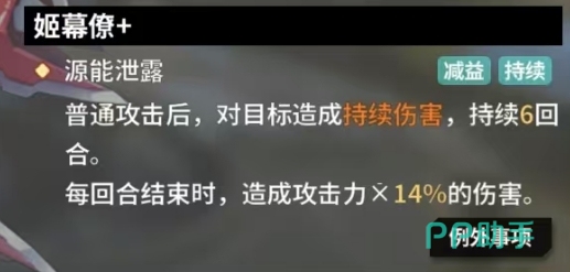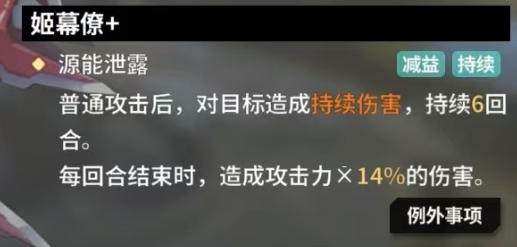 不知火的姬幕僚技能中的能源泄露有着独特的伤害模式,普通攻击后能够对目标施加持续6回合的负面状态,每回合结束时,会根据不知火自身的攻击力,按照一定比例对目标造成伤害,RANK1时为攻击力的6%,随着等级的提升RANK3时这一比例提升至10%,RANK7达到12%,而RANK10则可达到14%,这种技能在面对不同生命值构成的敌人时,都能稳定且持续地输出伤害,无论是面对高生命值的坦克型敌人,还是较为脆弱的后排角色,都能在多个回合内逐步削减其血量。