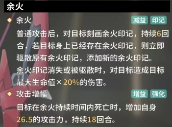 余火技能则更具策略性,它属于攻击增幅类技能,普通攻击后会在目标身上留下余火印记,此印记持续存在6回合,在这期间如果再次发动该技能,新印记会替换旧印记,当余火印记消失或者被驱散时,就会基于目标的最大生命值,对目标造成一定比例的伤害,RANK2时为8%,之后随着等级提升,RANK4达到11%,RANK6升至14%,RANK8则为20%。而且如果在余火持续时间内目标死亡,不知火自身还能获得攻击力加成,数值为26.5,这一加成效果能够持续18回合,让她在后续的战斗中输出能力更上一层楼。